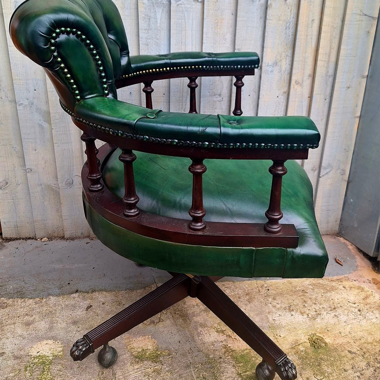 A Green Leather Swivel Captains Chair In Good Overall Vintage Condition! In Full Working Order Complete With Castors.